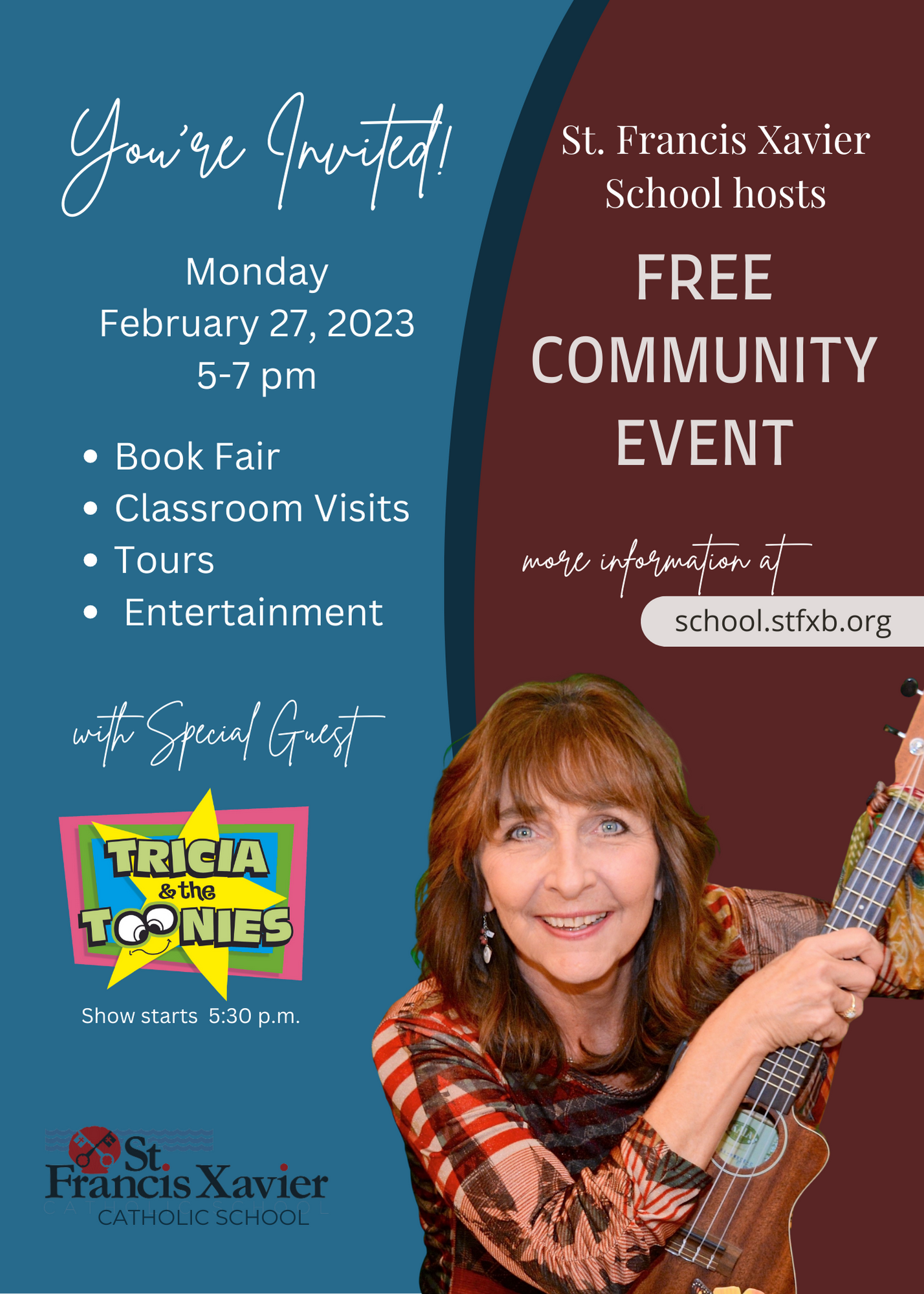 Join us Monday, February 27, from 5:00-7:00 pm for our Preschool/Kindergarten Open House. We are excited to announce that special guest, Tricia and the Toonies, will be performing during our event at 5:30. Trisha and the Toonie's show is a unique blend of high-energy music, comedy, colorful puppet characters and lots of audience participation! This event is free and open to all families with young children. Help us spread the word.